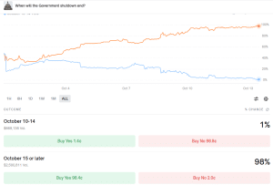 当前美国联邦政府停摆已进入第三周,若持续可能推迟至少16支加密ETF的审批进程。去中心化预测平台Polymarket用户普遍认为停摆将延续至10月15日之后。