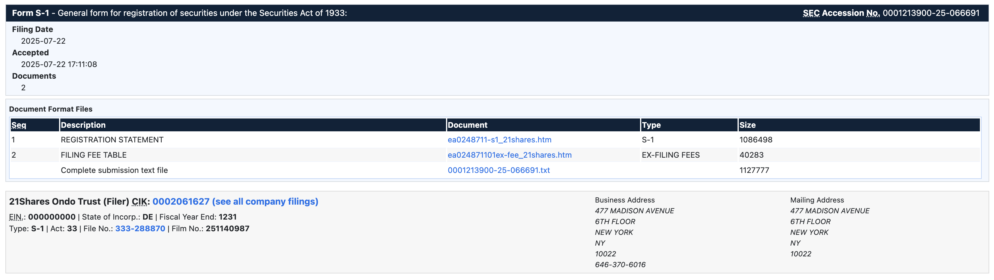 21Shares提交ONDO代币现货ETF申请 引发市场关注