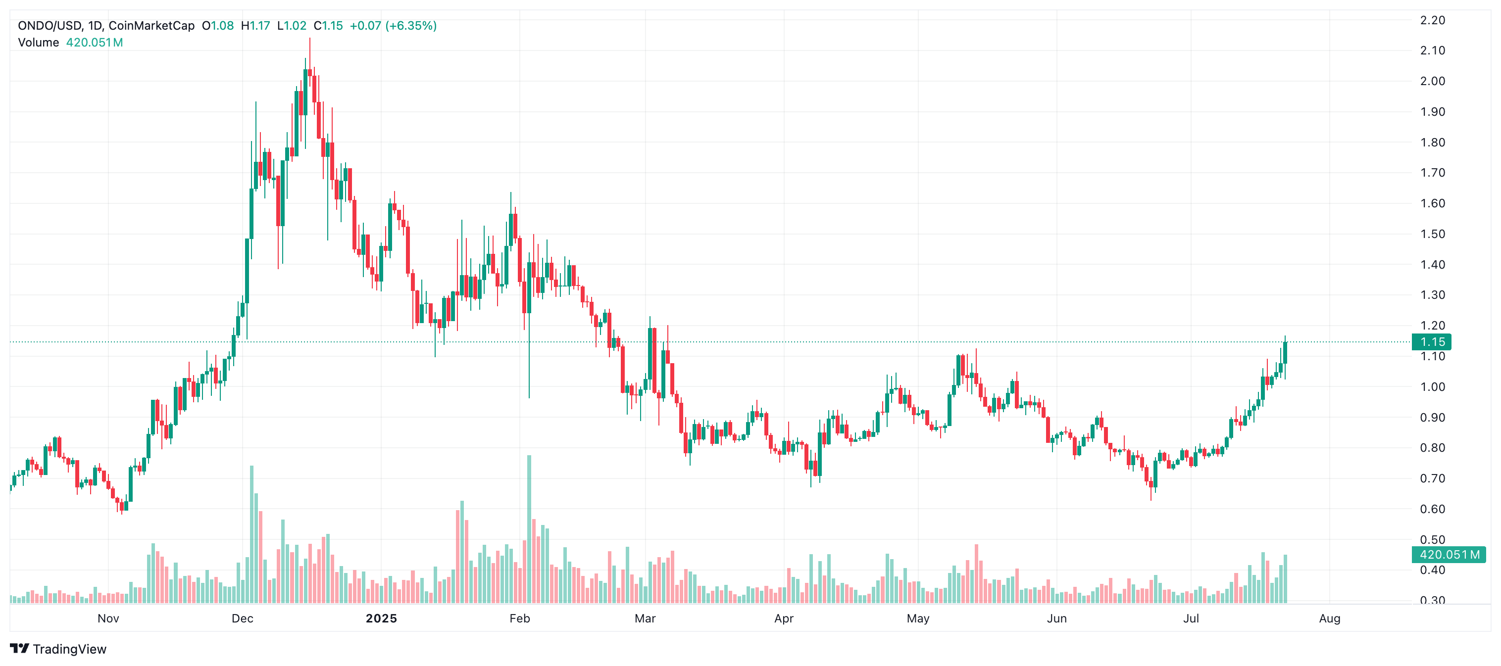 21Shares向美国证券交易委员会(SEC)提交了针对ONDO代币的现货ETF注册声明(S-1),这一重要举措令该代币获得市场瞩目。ONDO Finance由高盛前员工Nathan Allman和Pinku Suran于2021年创立,专注于将国债和货币市场基金等现实世界资产(RWA)代币化。该代币近期被World Liberty Financial纳入其多元化财政储备,购入价值约50万美元的ONDO代币,显示出与唐纳德·特朗普及其关联人士的特殊联系。此外,该公司宣布计划通过收购持牌经纪商Oasis Pro,以及与Pantera合作推出2.5亿美元RWA投资计划,进一步拓展在美国的代币化业务。