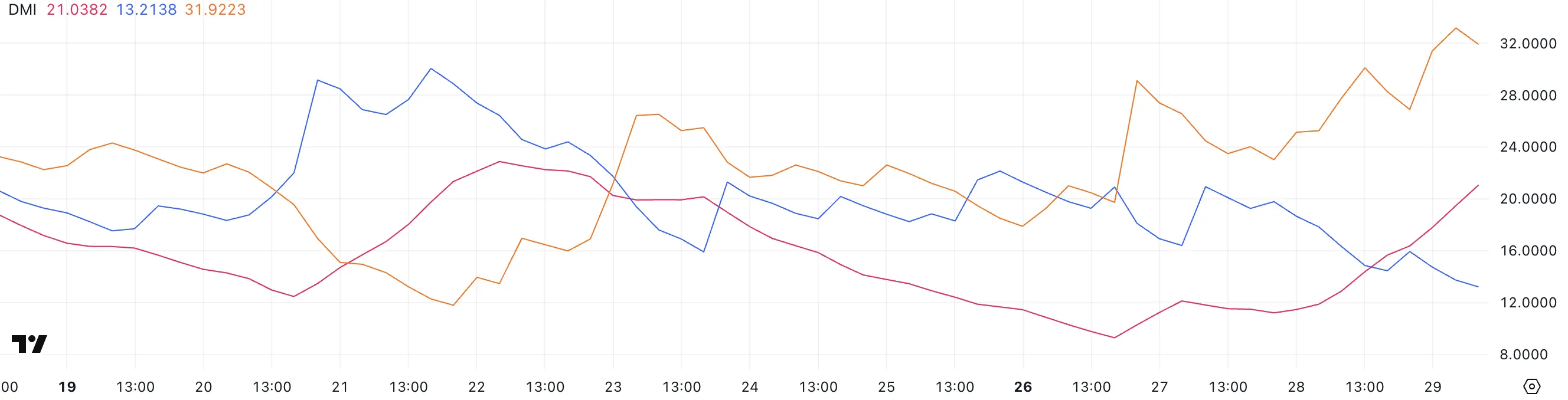 - ADX数值从11.46快速攀升至21,突破20强弱分界线