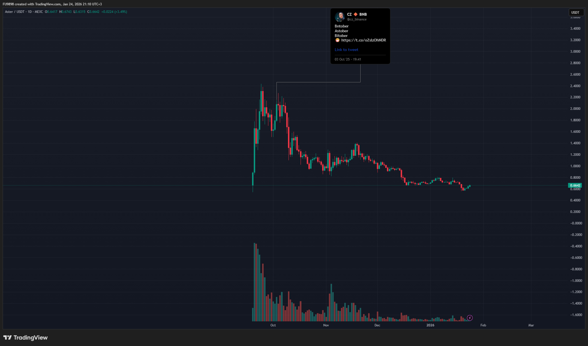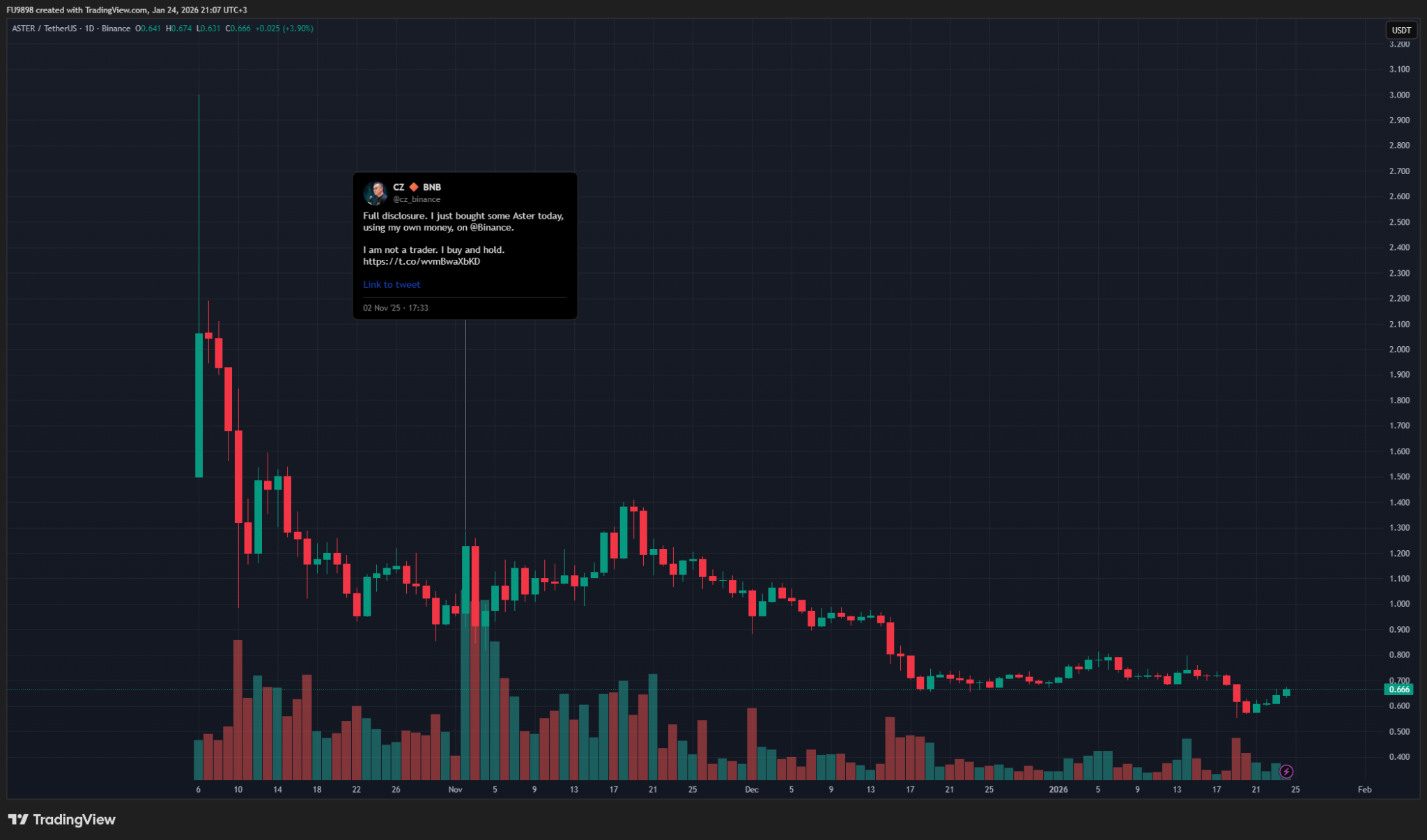 Strong指控中最引人注目的部分涉及去中心化交易所Aster DEX及其代币ASTER。该项目于2025年秋季推出,分析师称CZ曾大力推广该项目,使其价格在币安现货上架时达到峰值,随后急剧下跌。据称币安及相关钱包在此期间持续大量抛售ASTER代币。