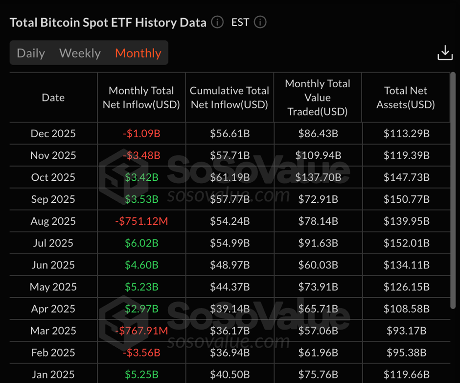 2025年11月和12月均录得比特币ETF资金净流出,成为该产品上市后首次连续两月呈现负增长。