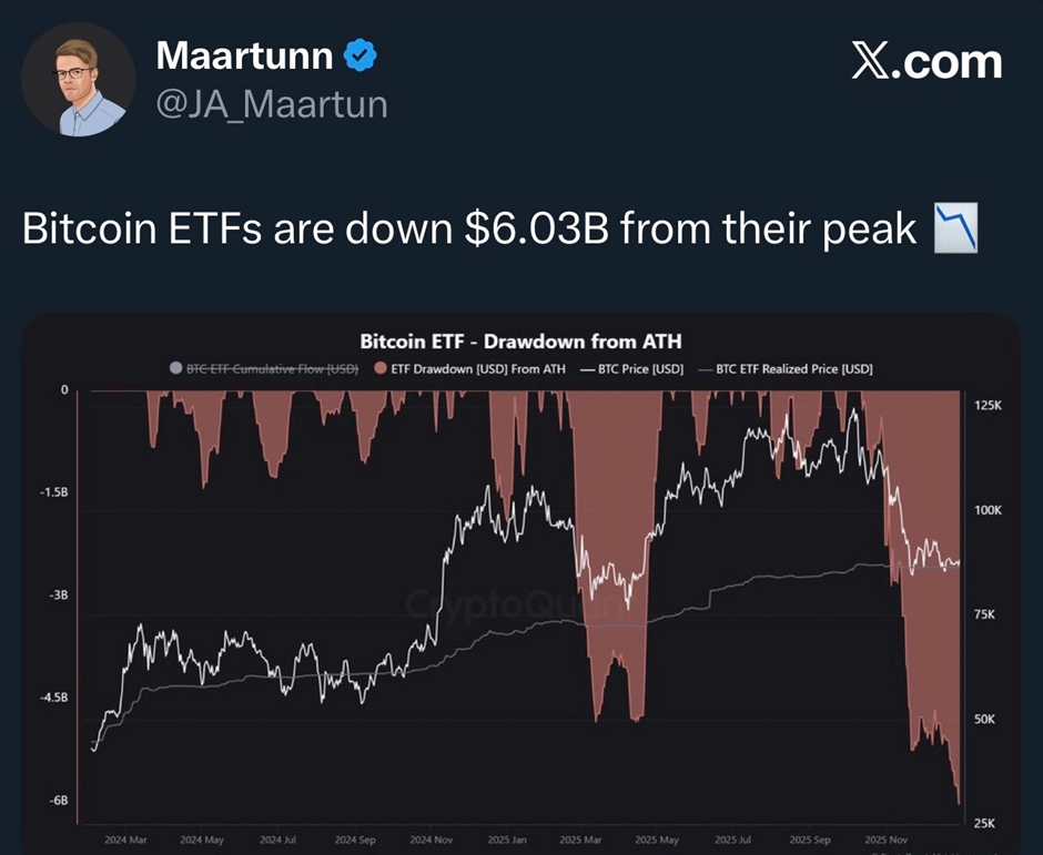 这一趋势持续至2025年10月,当时ETF总持仓规模达到历史峰值。但此后形势逆转:从10月约12.6万美元的高点至今,ETF总持仓已蒸发超60亿美元,表明早期主力买盘正在消退。