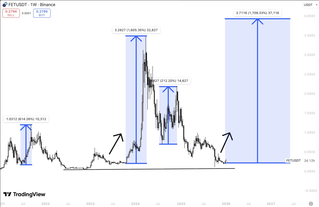 图表揭示,过往的上涨行情并非始于强劲动能或市场狂热,每一次重大突破均发生在长期低位盘整之后。FET曾多次在相同价格区间内盘整数周乃至数月,随后突然启动上行趋势。当前模式再次显现——价格正进入曾多次作为起跳板的历史关键区间。