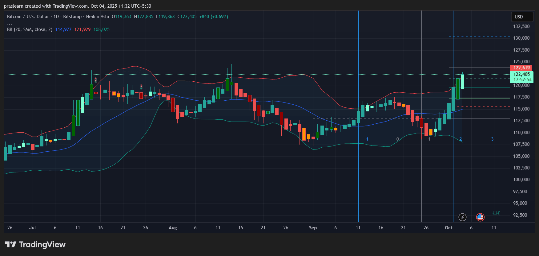 图表印证了这一情景:比特币价格突破20日均线并紧贴布林带上轨。动量指标显示交易者正为通胀风险布局,未来数周或推动价格上探130,000美元。