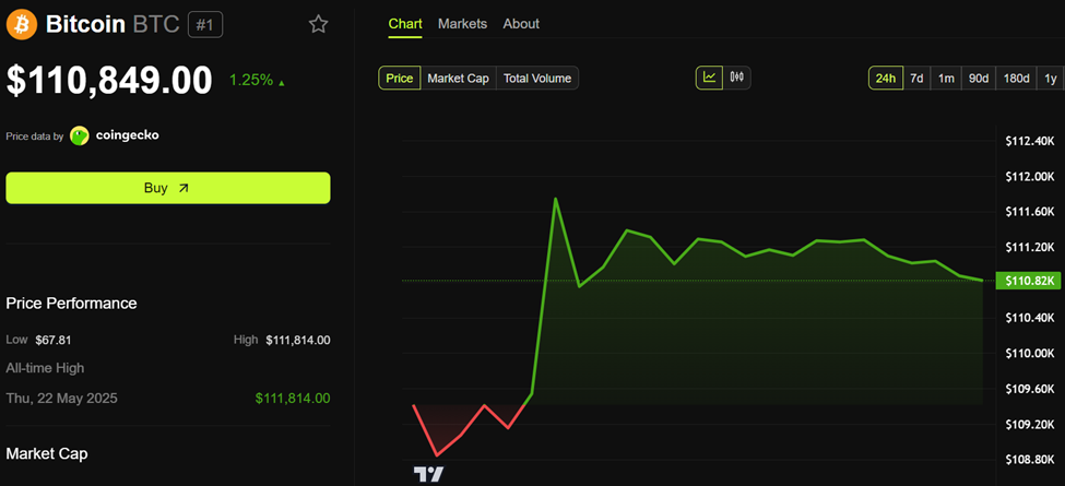 技术分析师布林格指出:"随着本周行情启动,比特币似乎正在酝酿向上突破。"乐观情绪持续蔓延之际,比特币在币安交易所创下111,999美元的高点。截至发稿,BTC交易价格为110,849美元,24小时上涨1.25%。