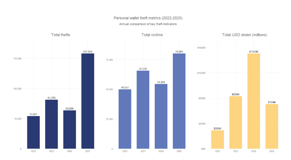 费尔曼同时指出,在光谱的另一端,个人钱包也已成为黑客的热门目标。这类攻击在2022年占被盗总额的7.3%,2024年跃升至44%。今年比例约为20%,但若排除Bybit黑客事件,该数字将接近37%。尽管事件数量较2022年增长近两倍,但单次个人钱包攻击的涉案金额从2024年的15亿美元降至今年的7.13亿美元。