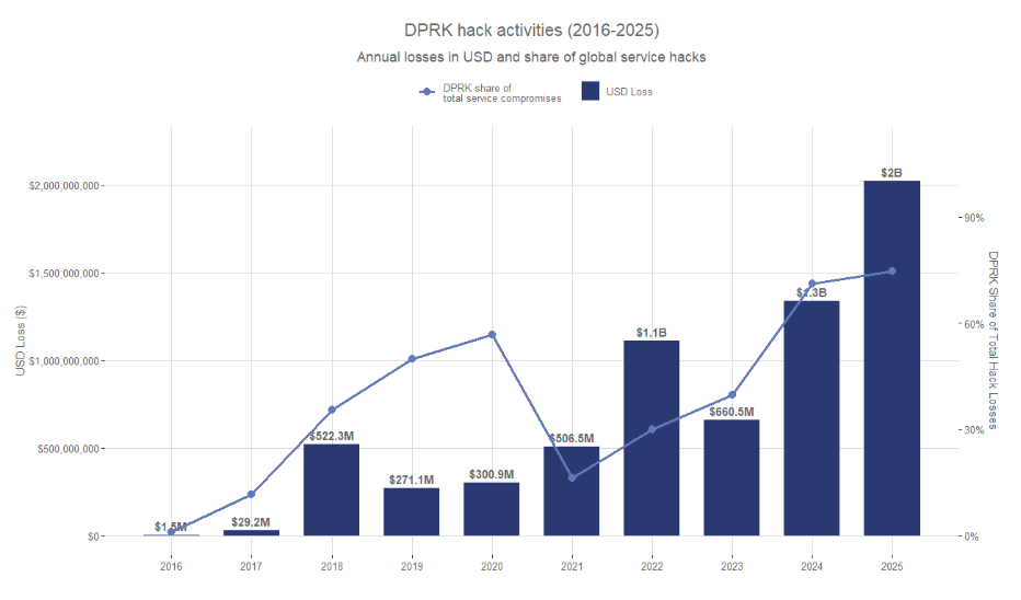 2025年朝鲜黑客组织通过派遣IT人员渗透项目等手法,窃取加密货币价值达20.2亿美元,较2024年增加6.81亿美元。分析发现,朝鲜黑客在2025年发动的攻击次数减少但破坏性更强,Chainalysis认为这源于其策略更趋精密且更具耐心,专注于获取更大收益。