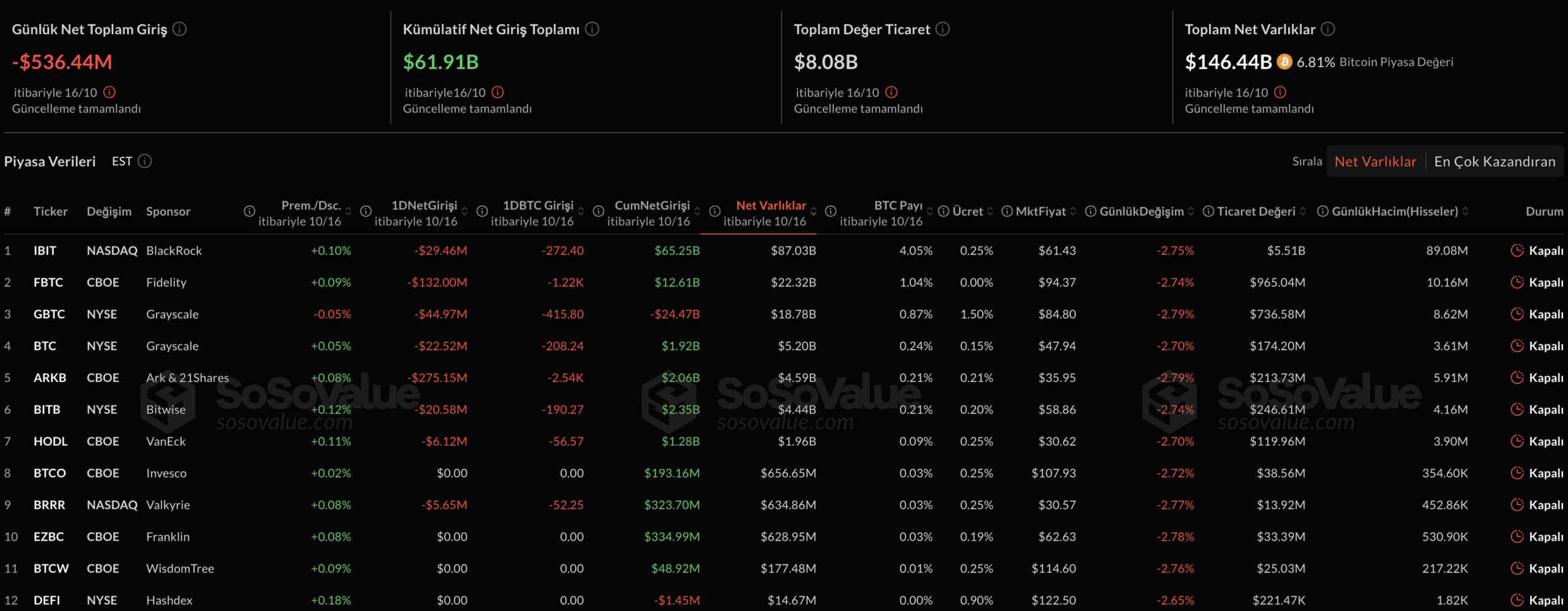 加密货币市场持续下行,周四美国比特币现货ETF出现5.364亿美元巨额净流出,进一步加剧了这一趋势。SoSoValue数据显示,这是自8月1日以来录得的单日最大资金外流。12只比特币ETF中有8只出现资金撤离,其中Ark & 21Shares的ARKB流失2.7515亿美元,富达FBTC遭遇1.32亿美元赎回。此外,贝莱德、灰度、Bitwise、VanEck和Valkyrie等机构管理的ETF同样报告了负向资金流动。