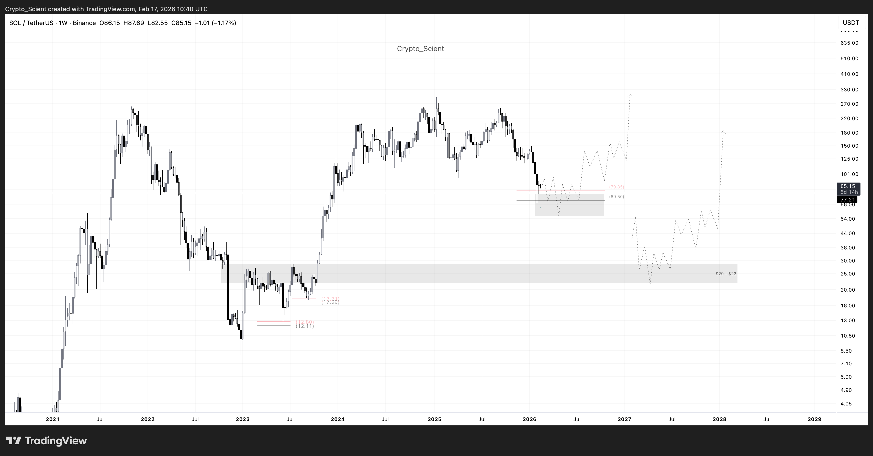 加密货币交易员Scient指出可能形成潜在底部的两个宏观区域。其一是60至70美元的0.75斐波那契回撤区域,这一水平通常与更大上行趋势中的深度回调相关。