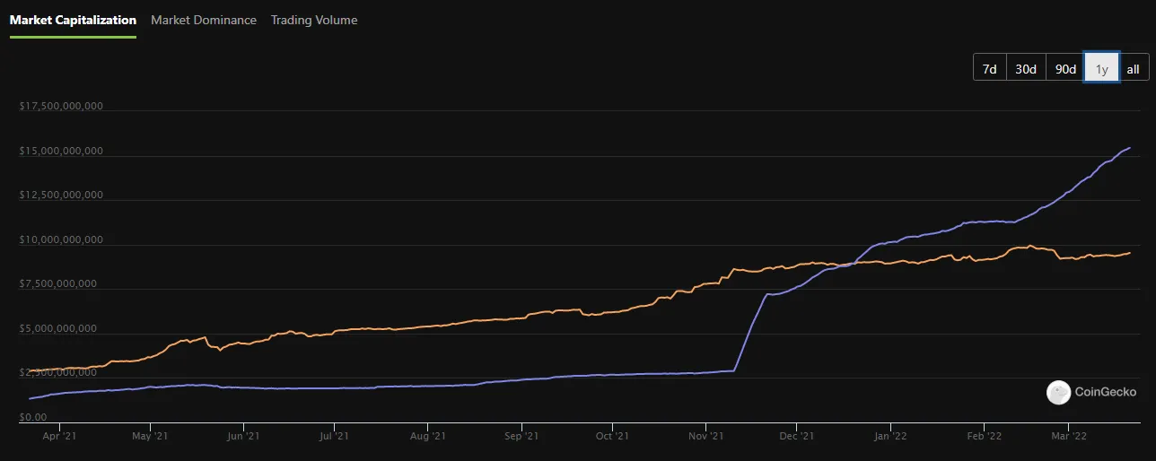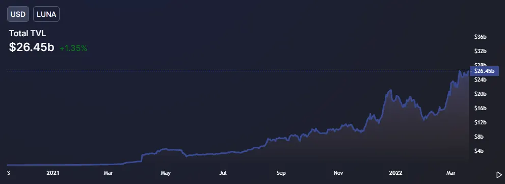 正如你所见,UST在去年12月取得了领先地位。当时,一些人可能认为这只是一次偶然,类似于过去其他昙花一现的稳定币尝试。然而,自那以后,UST的规模持续飙升。随着稳定币的增长,Terra的治理代币LUNA也随之上涨,目前已成为市值排名前十的加密货币,超过了Cardano、Solana和Avalanche。自UST在12月20日超越DAI以来,LUNA的价格从大约78美元上涨至目前的93.5美元,涨幅达19%。这两项资产的同步上涨并不令人意外,因为每次铸造更多的UST时,LUNA都会被销毁。随着Terra的去中心化金融(DeFi)生态系统扩展,对原生稳定币的需求增加,大量LUNA被销毁(意味着市场上可用的LUNA减少)。关于Terra的运作机制,可以查看我们的学习文章了解更多。