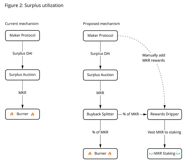 Terra的迅猛发展让许多人感到震惊,尤其是MakerDAO。现在,MakerDAO终于采取了行动。该项目已经实施或正在考虑一系列更新,以提高其稳定币的采用率,并重新思考其原生代币MKR的经济模型。这些变化的明确目标是将DeFi的原始中央银行重新带回巅峰。其中一个正在讨论的提案是将MKR转变为一种类似Curve和Yearn的"ve-"模型的投票锁定代币。这意味着,要参与各种治理提案,你需要质押你的MKR代币。作为回报,你将获得"stkMKR"和投票权。更重要的是,质押MKR代币的用户还将获得额外的MKR奖励(类似于质押或收益农场奖励)。这些奖励将通过盈余拍卖产生,这是一种在DAI过剩时触发的Maker事件。根据该提案,多余的DAI将被出售以换取MKR,并将拍卖的一部分转给stkMKR持有者。
