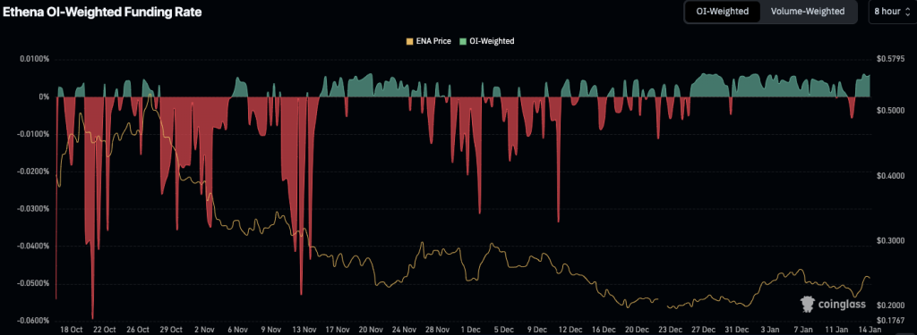 然而,近几周市场情绪也发生转变。持仓量加权资金费率图表显示,交易者已从过去数月以负费率为主的状况转向更为中性的立场。这一变化表明市场情绪正在转向,更多交易者开始对ENA建立多头头寸。