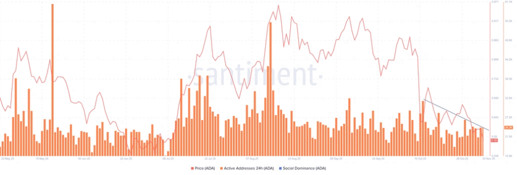 但分析师指出,近期大额持有者正将ADA移出交易所,可能暗示长期积累行为。尽管价格下跌,过去60天内网络新增超过10万个钱包地址。