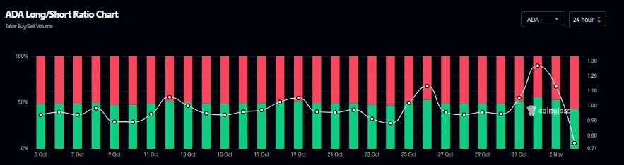 与此同时,CoinGlass数据显示ADA多空比率周一降至0.75,这是一个月来的最低水平。该数值低于1表明押注ADA价格下跌的交易者多于看涨者。