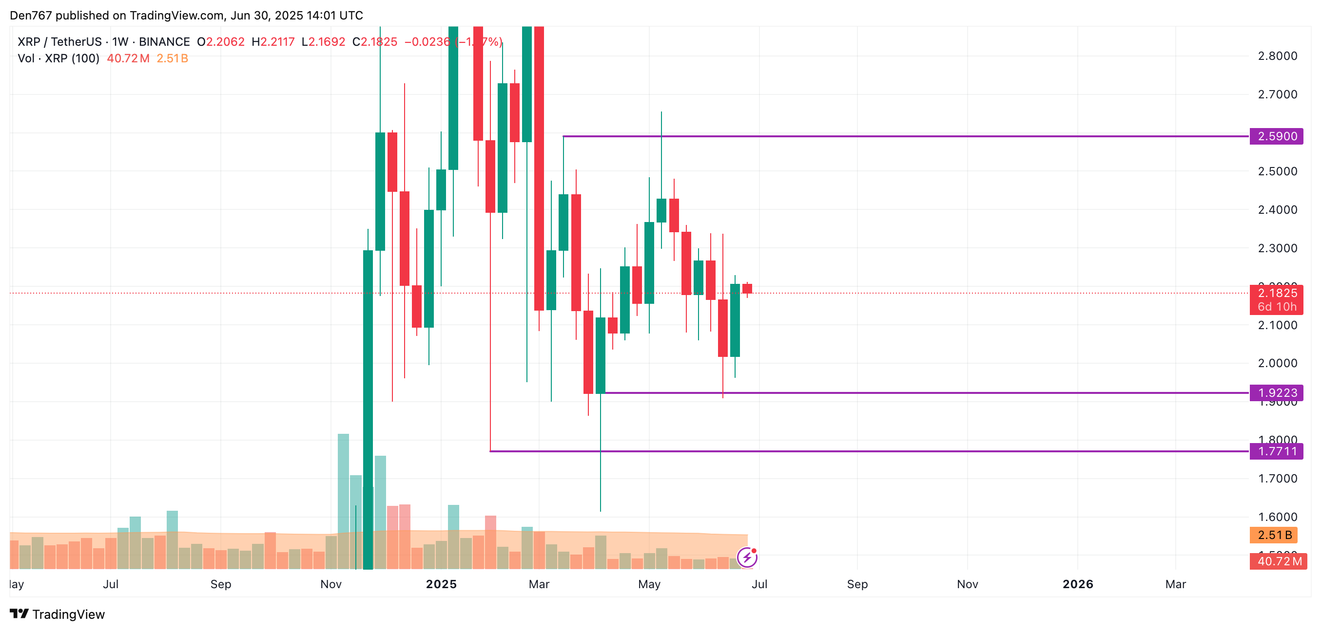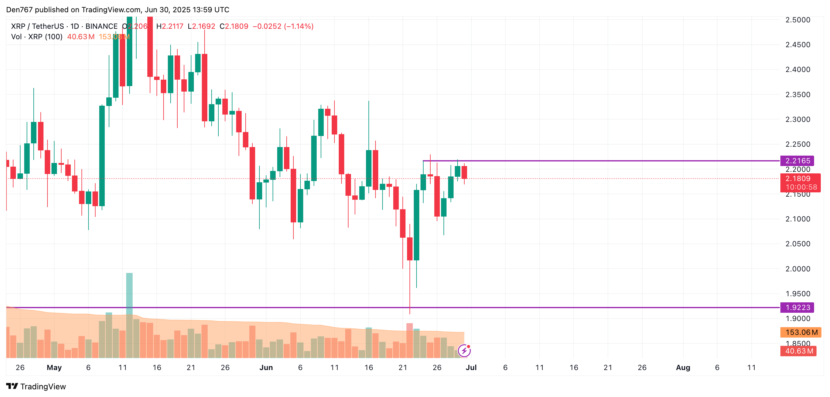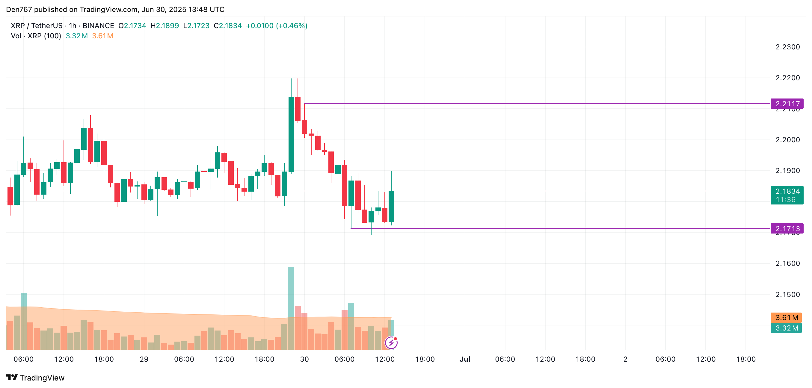 小时线图表显示,XRP价格对2.1713美元支撑位形成假突破。若涨势延续,预计明日将测试2.20-2.21美元区间。