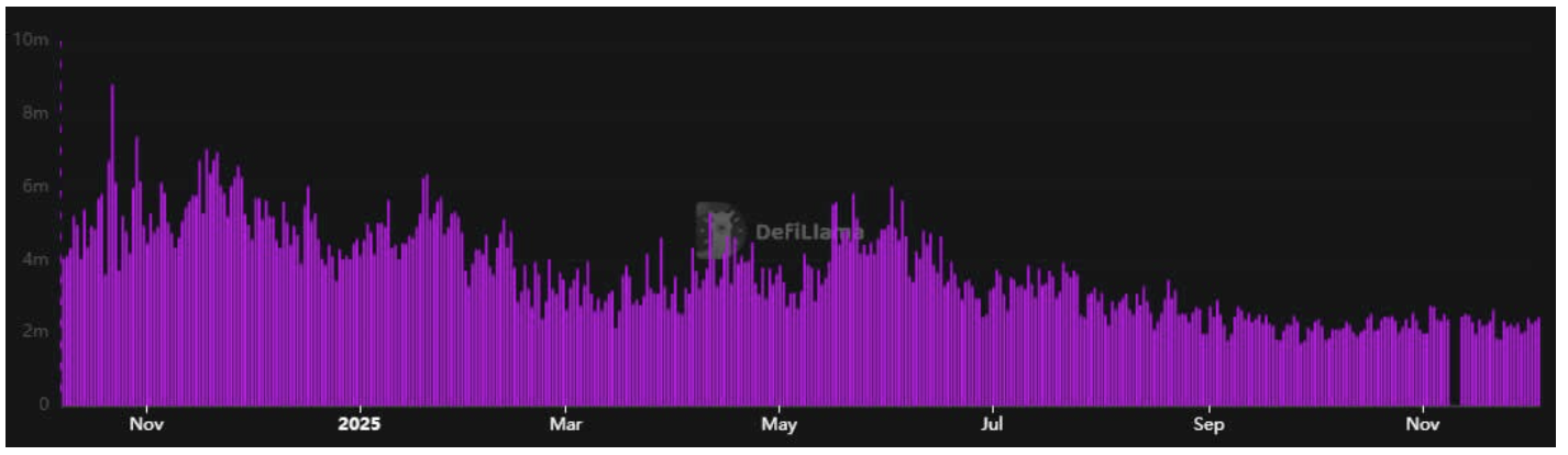 近期,Base和Solana都因Memecoin铸造和处理高速交易而备受关注。然而,Solana的活跃地址数量在过去一年中持续下降,从2024年11月的逾600万降至当前的240万。尽管Base的活跃地址也有所减少,但该网络在11月创下了4.07亿笔交易的纪录。