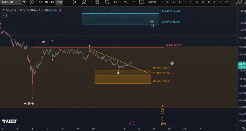 Solana(SOL)正试图突破币安15分钟图表中的黄色下降趋势线。分析师指出,截至目前仅观察到三波上行波动,表明此轮走势可能属于调整性质,而非驱动性上涨。