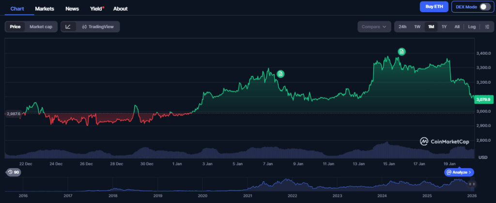 以太坊近期经历了一段艰难时期。过去30日内,其价格从3100美元最高攀升至3300美元,但未能维持涨势,迅速回落至3000美元关口。