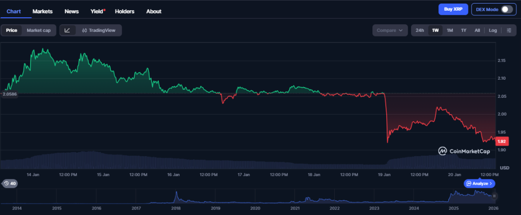 尽管被视为优质替代币选项,瑞波币近期同样呈现波动态势。数据显示,仅过去一周其价格就从2美元附近跌至1.90美元左右,单周跌幅超5%。