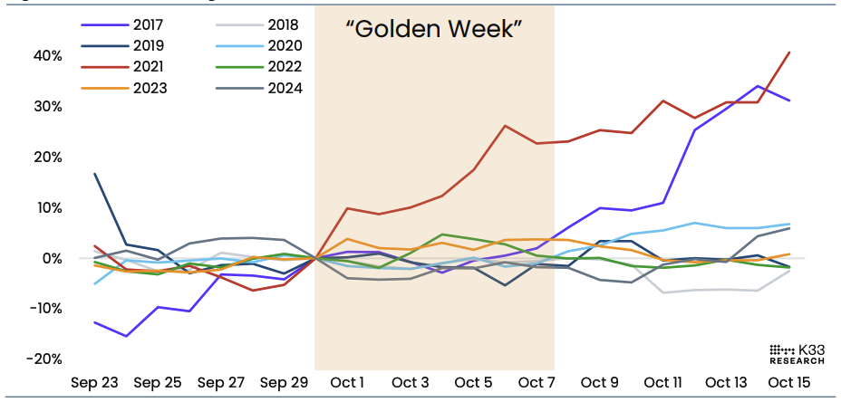 中国黄金周假期从10月1日持续至7日,韩国公休日则从3日延续至9日。区域性休市通常降低市场参与度,导致十月初波动性创局部低点。K33研究总监Vetle Lunde指出,今年亚洲交易时段综合收益率为-9.7%,而现货ETF通过后的显著上涨均发生在美国交易时段。获利了结与相对低流动性是造成时段表现差异的主因。