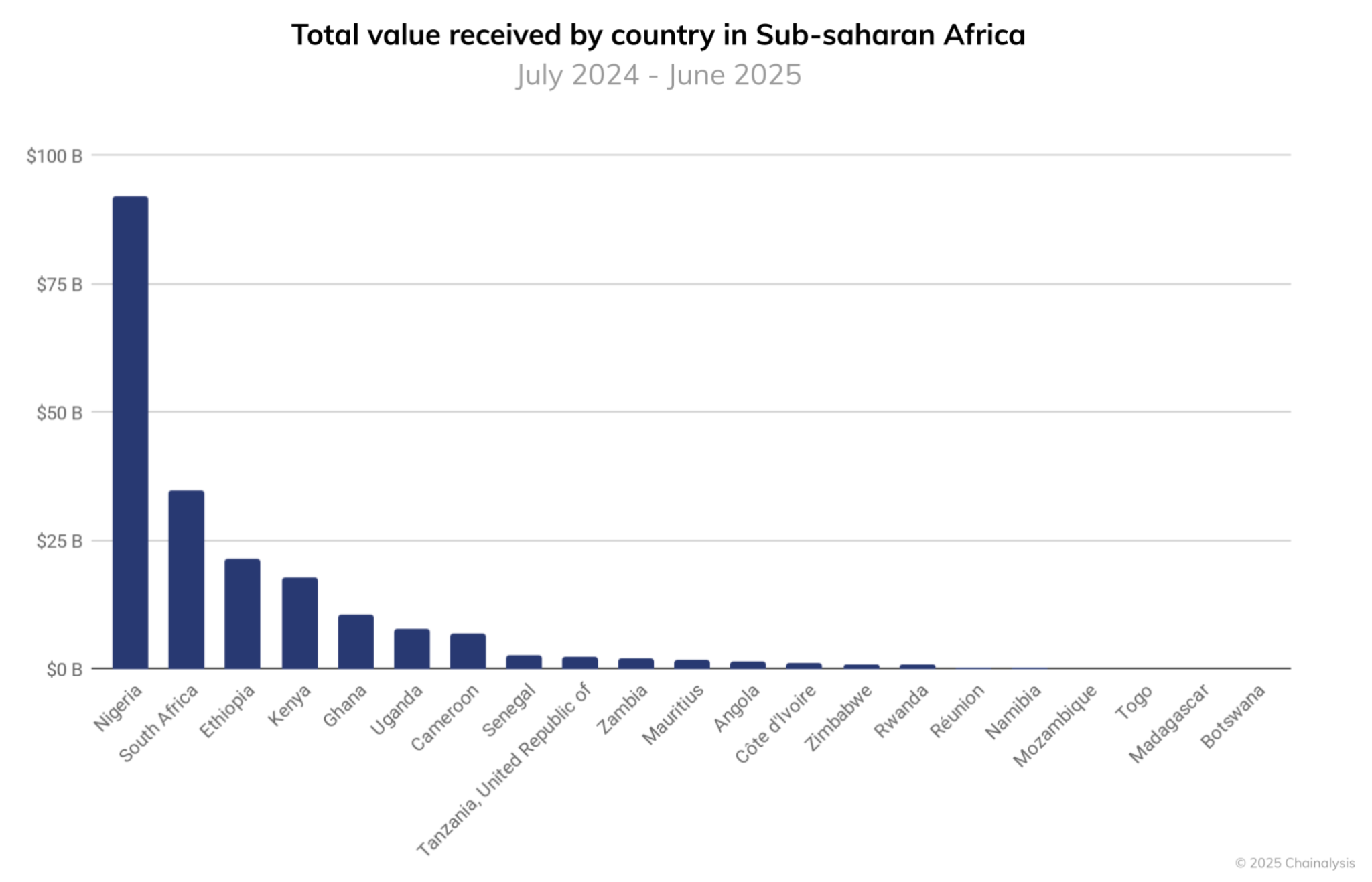 数据显示,尼日利亚在此期间持续主导地区市场,加密货币流入价值至少达920亿美元,近乎南非记录金额的三倍。与此同时,撒哈拉以南非洲地区链上总价值突破2050亿美元,较上年增长约52%。据Chainalysis统计,这一增长使该地区成为全球增速第三快的市场,仅次于亚太和拉丁美洲。