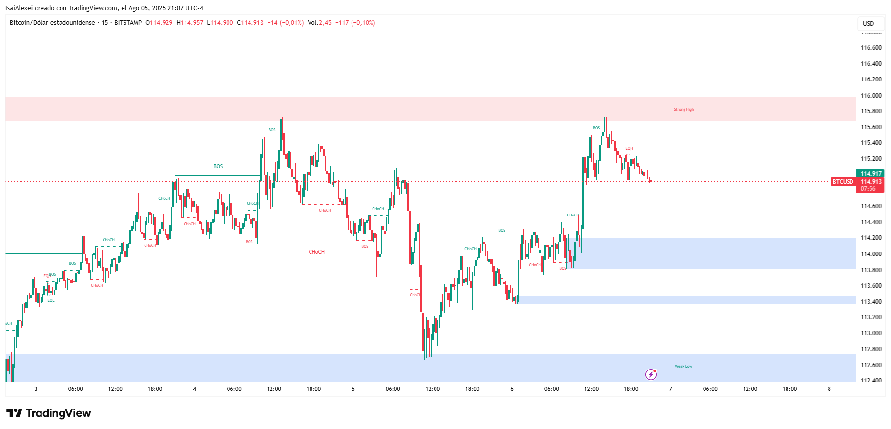 比特币(BTC)现报114,970美元附近,日内微跌0.05%,周线跌幅约2.4%。自7月14日创下123,100美元历史高点后,价格持续处于震荡整理阶段。