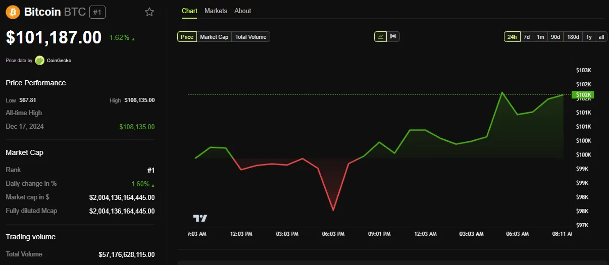 BeInCrypto数据显示,截至撰稿时,比特币的交易价格为...,自周五开盘以来小幅上涨1.62%。