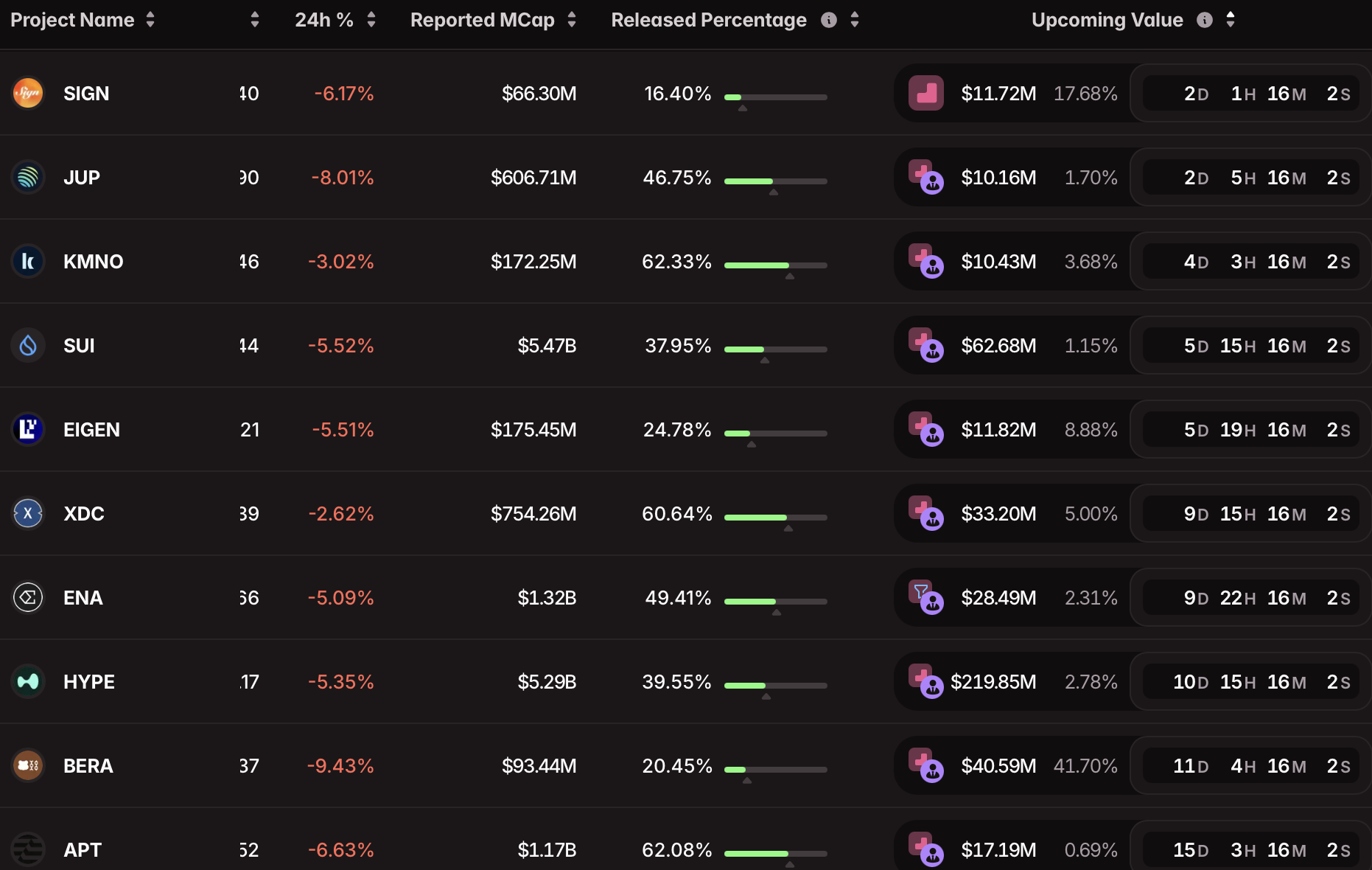 根据1月26日至2月1日(第五周)的即将释放计划,多个大型和中型项目预计将解锁价值超过2亿美元的代币,这可能影响短期价格走势。其中最受关注的项目包括Sui、EigenCloud、Optimism和Sign,它们都将在几天内面临显著的供应扩张。