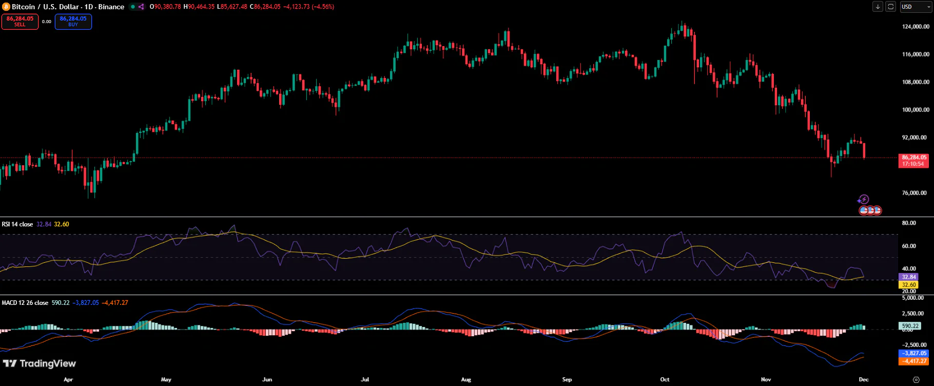 图表信号难以给短期走势带来慰藉。比特币日线图清晰显示9.2万美元阻力区再度失守,且自10月下旬以来已多次形成更低高点模式。相对强弱指数虽接近超卖区域但未现衰竭信号,MACD指标持续下行——表明空头仍掌控走势动能。