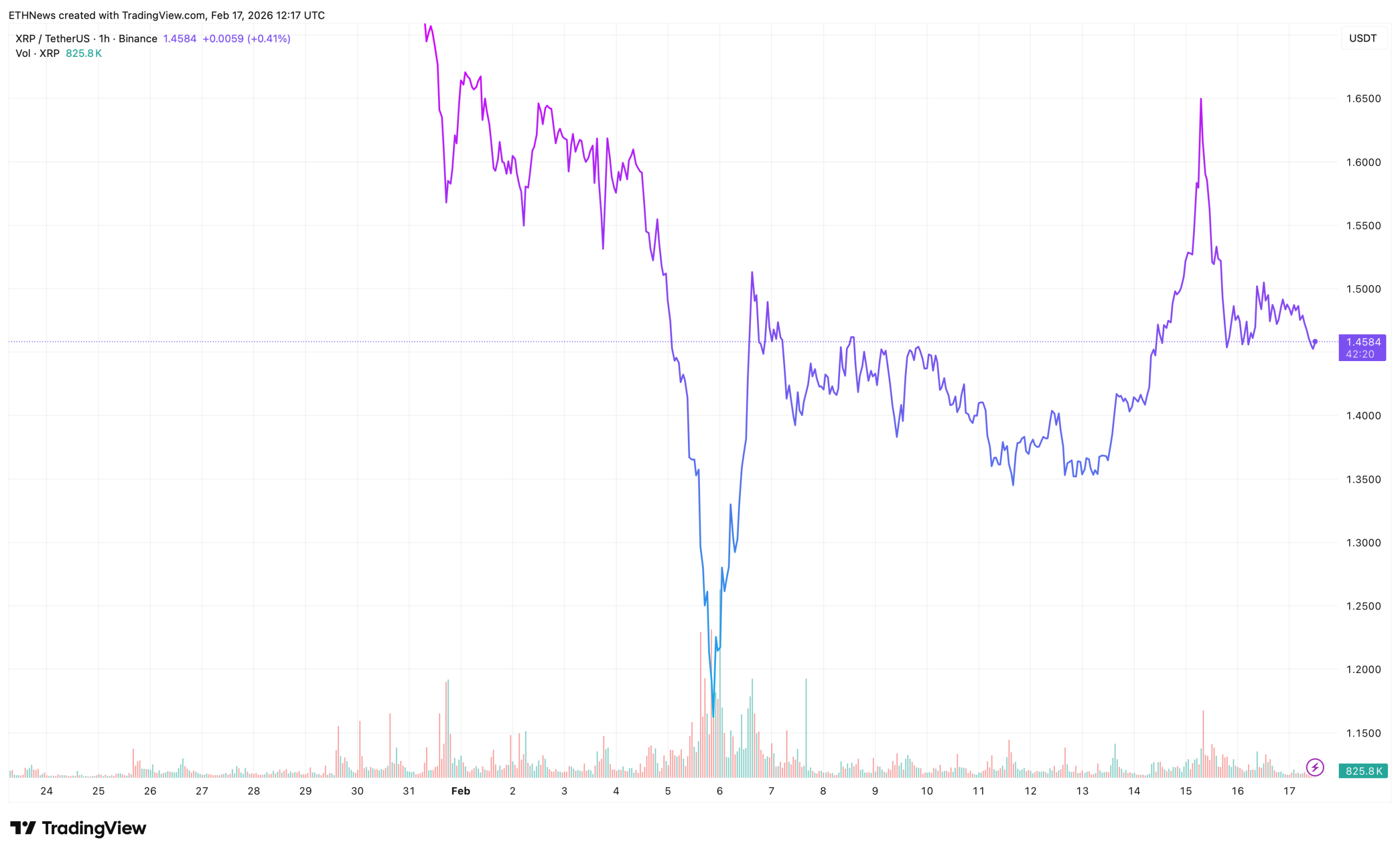 XRP 当前交易价格约为 1.45 美元,守住了 1.38 美元至 1.42 美元附近突出的需求区域。该区域目前是即时的短期支撑。只要盘整能维持在该区域上方,近期从压缩状态中的突破在技术上就仍然有效。