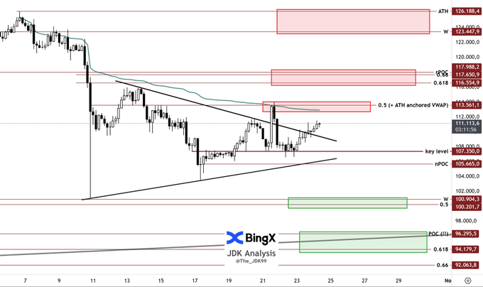 技术分析显示,比特币价格突破下降趋势线后显现新动能,买方力量正在逐步回归。根据JDK Analysis观点,市场正蓄势测试113,500-116,000美元区间内的历史成交量加权平均价(VWAP)阻力带,该区域恰位于0.5斐波那契回撤位附近。若有效突破,价格可能冲击120,000美元或再探历史高点。