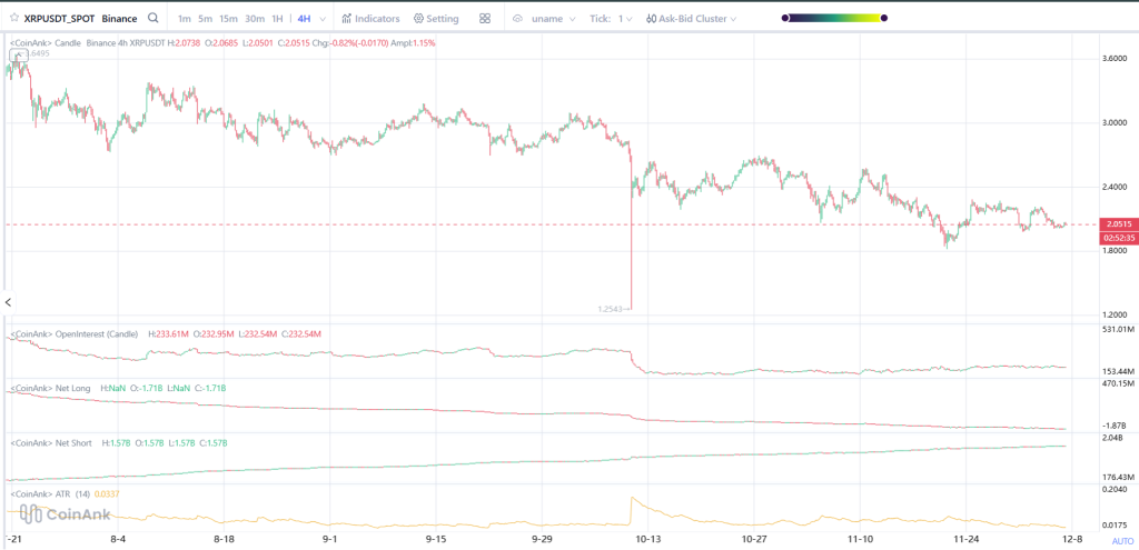 在4小时图表中,XRP自11月初2.40美元附近的高点持续下行,目前徘徊于2.05美元区间,形成买盘压力递减的下降高点。图表最显著波动发生在10月中旬,价格直线下挫至1.25美元后强势反弹。此后XRP始终未能重建有效趋势结构,目前呈现略带下倾的横盘整理格局。