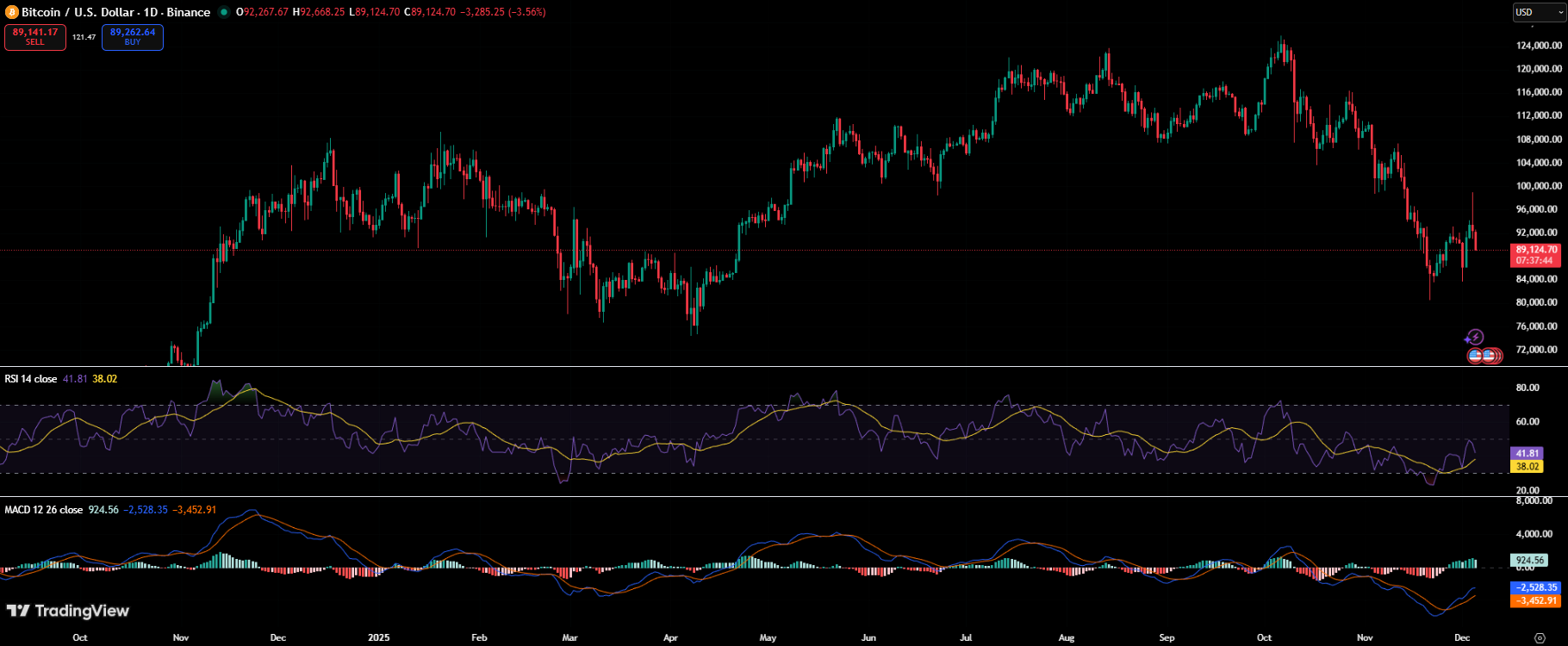 主要加密货币目前交易价格接近89,200美元,日内大幅下挫,延续了过去一周的跌势。此次回调发生在市场流动性收紧、多头尝试失败后交易员持续平仓的背景下。