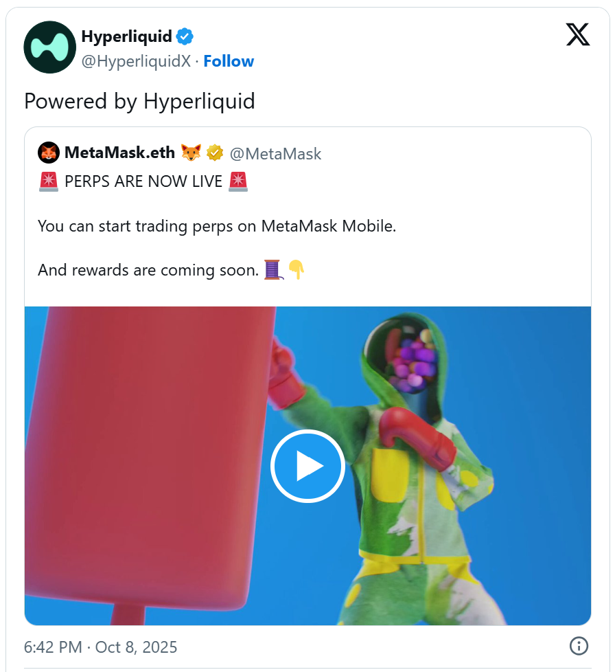 此次合作既展现了MetaMask提升行业渗透率的努力,也印证了Hyperliquid在加密货币领域日益重要的角色,特别是在去中心化生态中增强永续合约可及性方面。该公告同时标志着双方迎来里程碑时刻。
