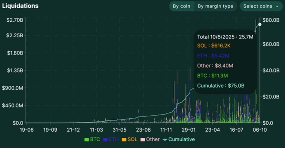 市场亢奋期往往伴随更高清算量。近期比特币和BNB等加密货币创历史新高时便出现这种情况。最新市场数据显示,Hyperliquid平台总清算量已突破750亿美元大关。