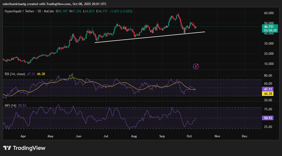 价格走势方面,HYPE目前较2025年最低点保持384%的健康溢价。但需注意,截至发稿时46美元的价格较年内高点仍有21%折价。