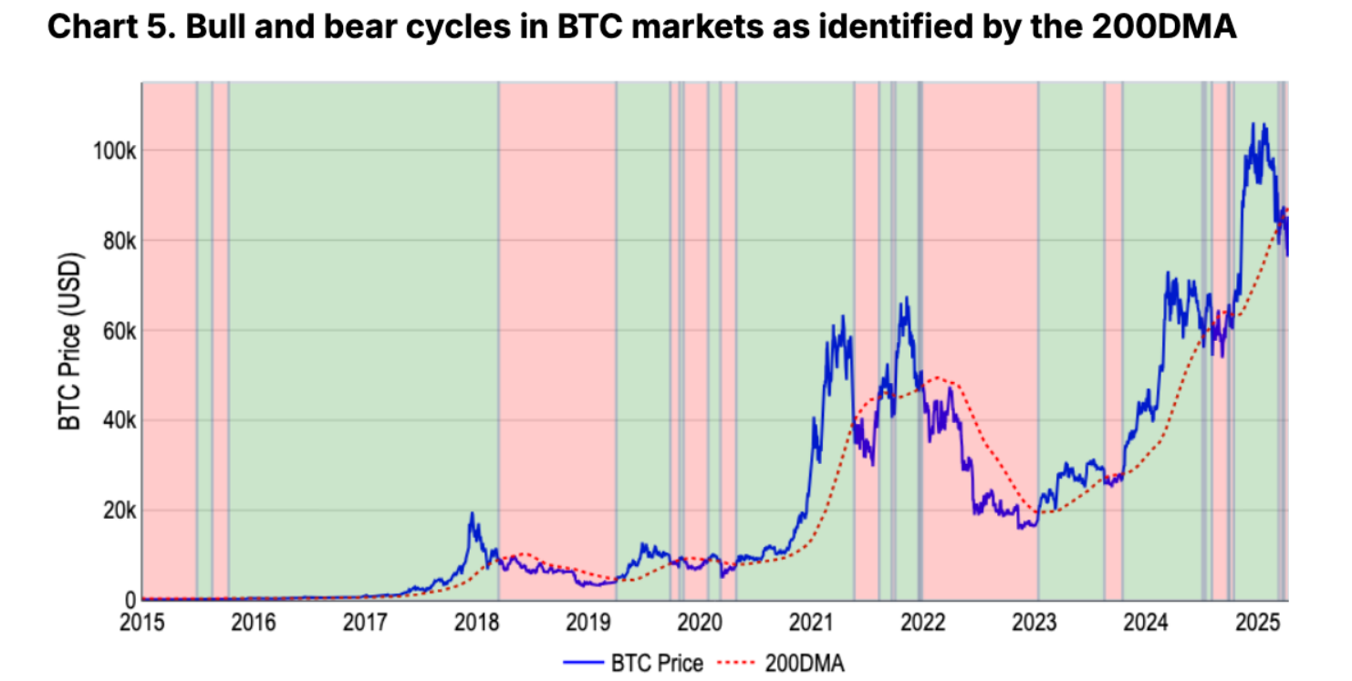传统市场通常将较近期高点下跌20%定义为熊市阶段。但加密货币市场并不遵循传统规则。2021年11月至2022年11月期间,比特币下跌76%,而同期美国股市仅下跌22%。这种波动性既放大了恐惧,也创造了机会。随着比特币跌破200日移动平均线,历史模型表明看跌趋势可能正在形成。