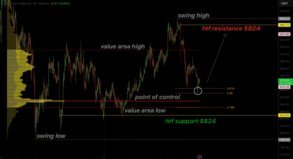 若反弹行情延续,价格可能逼近950美元阻力位。该区域既代表历史抛压显著区,亦与前期市场结构相呼应。突破此阻力将确认更大幅度的回调反弹,若买家能维持动能,则可能开启进一步上行空间。