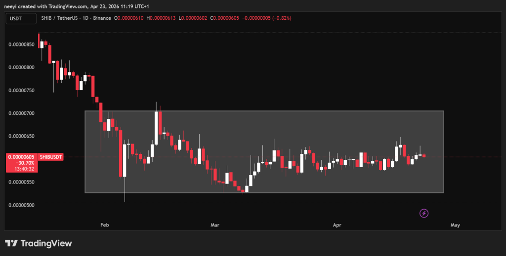 Shiba Inu(SHIB)价格目前在约0.00000607美元附近交投,较其1月份高点已下跌约40%。而从更大的时间框架看,形势更为严峻,价格较2024年峰值已下跌近90%。