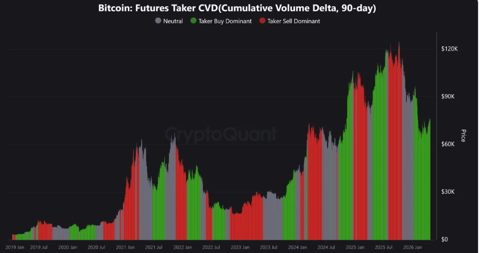 90日期货主动交易量差额指标同样印证了这一趋势。该衡量三个月期间买卖量差异的指标自三月下旬以来持续稳步上升。CryptoQuant分析师阿卜杜拉·齐亚表示:“这种持续增长确认了积极的市场参与者正在持续消耗卖盘挂单,这是显示需求正在主动吸收期货市场卖盘流动性的高确信度信号。”
