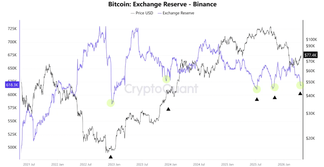 CryptoQuant交易所储备数据显示供应趋紧迹象,币安比特币余额“持续显著下降”。图表显示币安比特币存量已从1月初的约67.5万枚降至约61.83万枚。如此低的存量水平在历史上往往对应比特币宏观底部,如2022年末、2024年初及2025年中期。