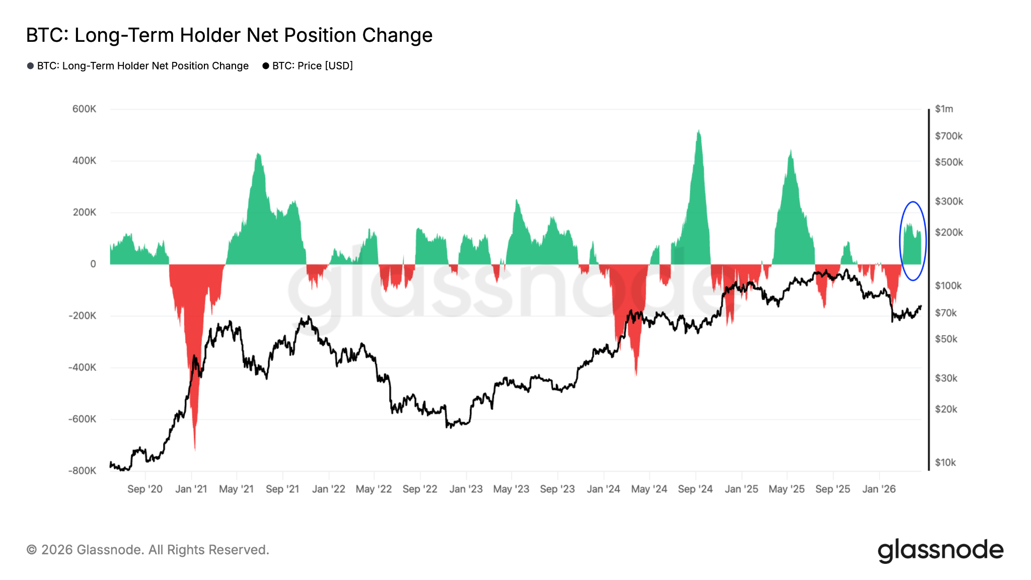 其他数据同样反映积累阶段特征:持有比特币超过155天的长期持有者正加速买入。自3月1日以来,长期持有者净头寸变化持续为正,过去30天内累计增持约13万枚比特币。