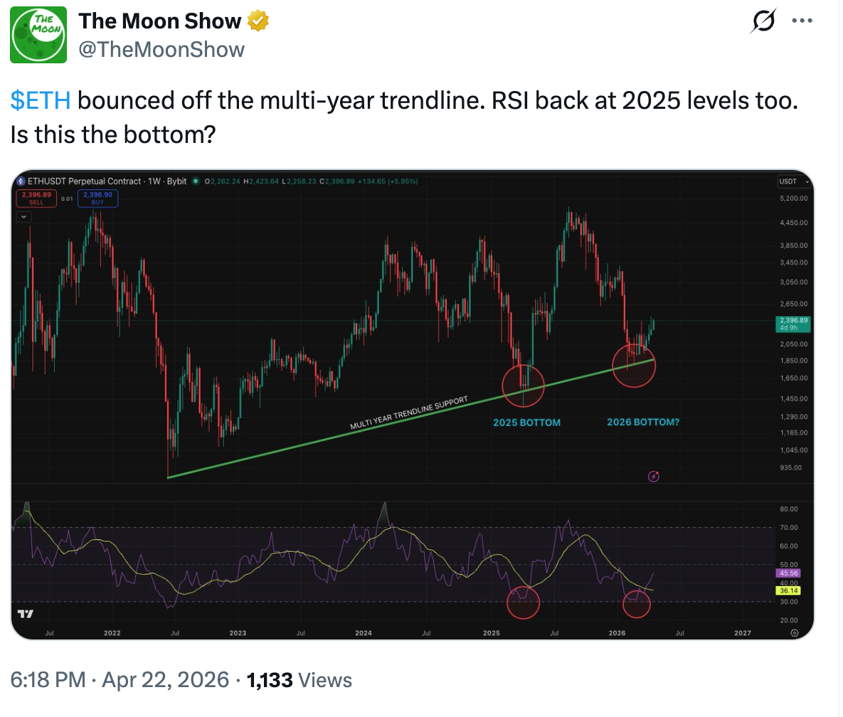 移动平均收敛发散指标(MACD)形成的看涨交叉进一步确认了价格底部。分析师Ash Crypto表示:“ETH周线MACD看涨交叉现已确认,此前两次出现该信号后,ETH分别上涨183%与75%。”与此同时,周线相对强弱指数正从历史宏观低点水平回升,暗示近期1750美元的低位已成底部。