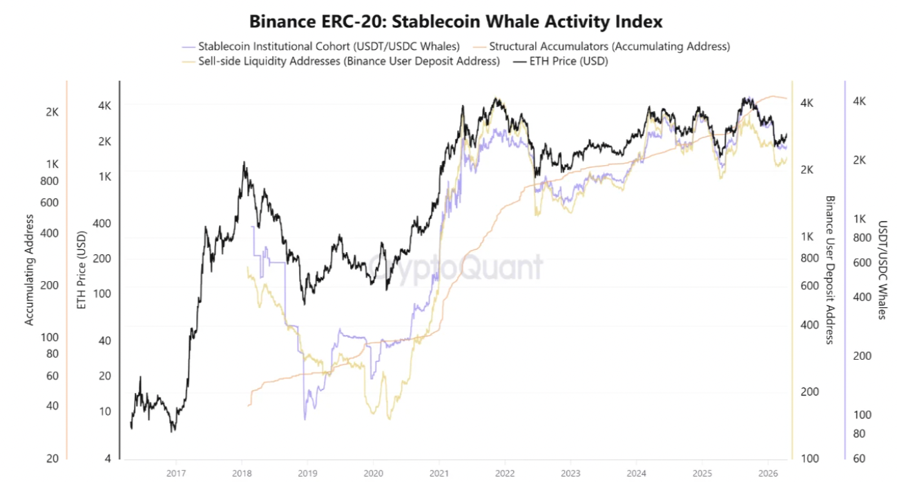 以太坊链上指标显示出供应动态趋紧,这种情形曾在历史中引发显著价格上涨。币安ERC-20稳定币鲸鱼活动指数揭示结构性供应衰竭:每日积累地址(持续买入ETH的钱包)已增至2434个,超过准备抛售的交易所存款地址数量(降至2300个)。