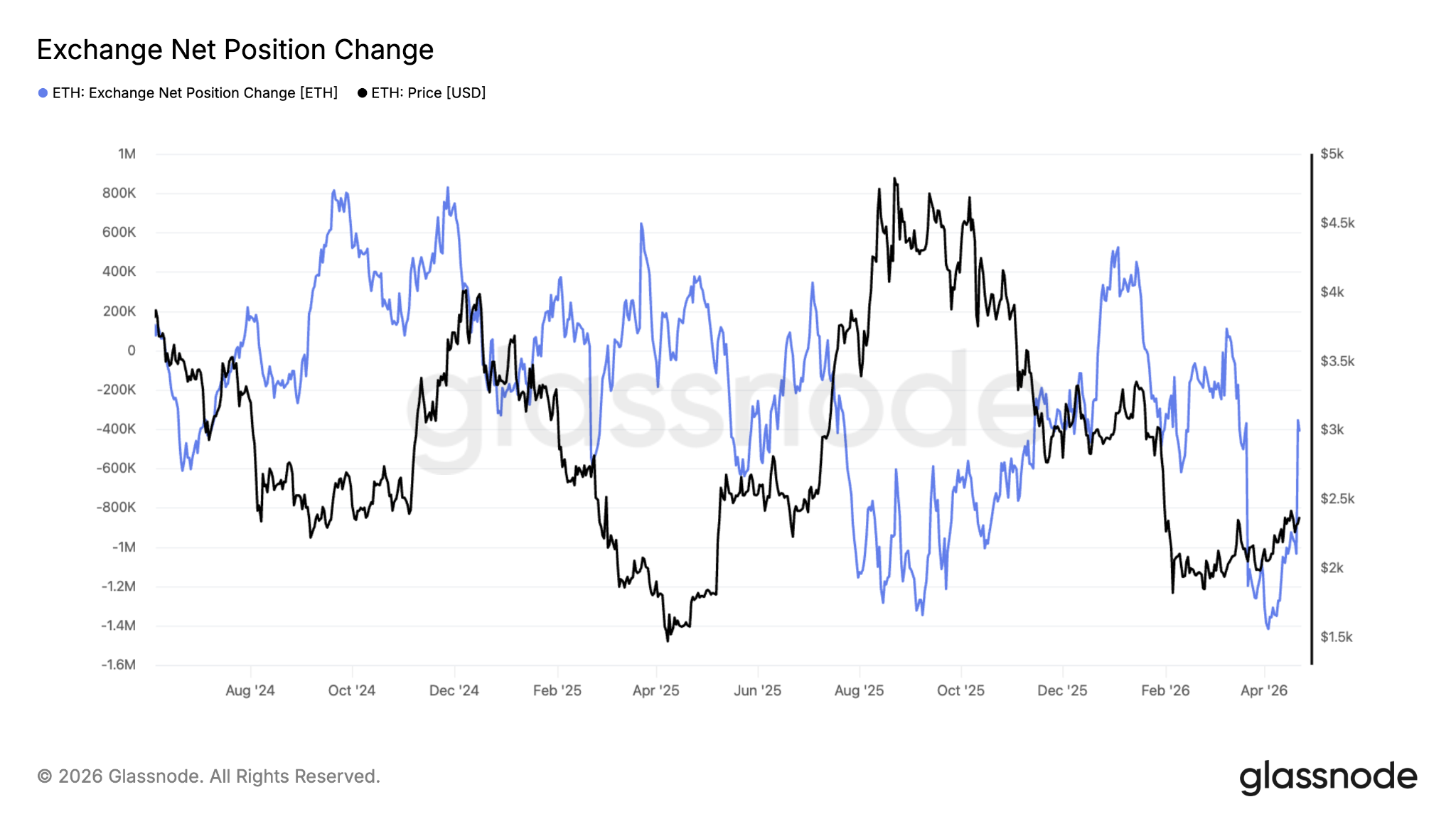 交易所流出数据进一步强化这一趋势。Glassnode数据显示,4月2日交易所ETH净持仓量单日减少140万枚,创七个月最大降幅。截至统计时,交易所净持仓变化已达-35.13万枚ETH。