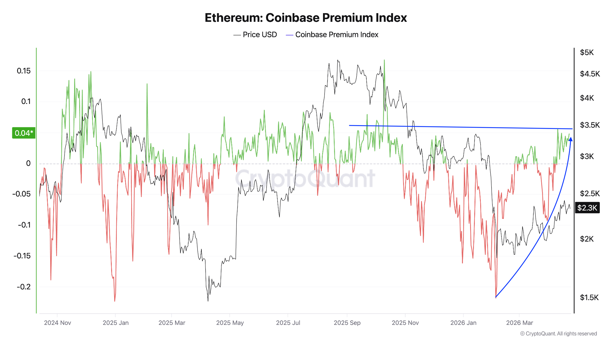 随着币安ETH期货持仓量升至近两个月高点,以太坊买家正积极入场。需求激增部分源自美国市场复苏——Coinbase溢价指数自4月4日转正后持续攀升,4月14日达0.055,创2025年10月以来新高。该指数在今年2月初曾跌至-0.21,目前读数稳定在0.04水平,通常预示机构投资者需求增长。