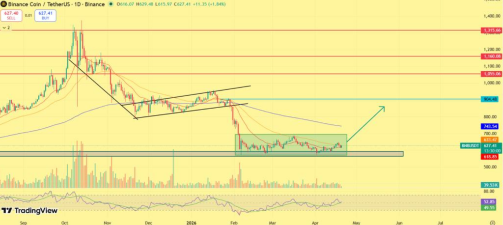 然而,当前的横盘走势符合先前周期中出现的更广泛模式。历史上,BNB在经历强劲的向上扩张之前,通常会进入类似的平静区域。因此,市场参与者正密切关注此次整理阶段是否会引发下一次突破。