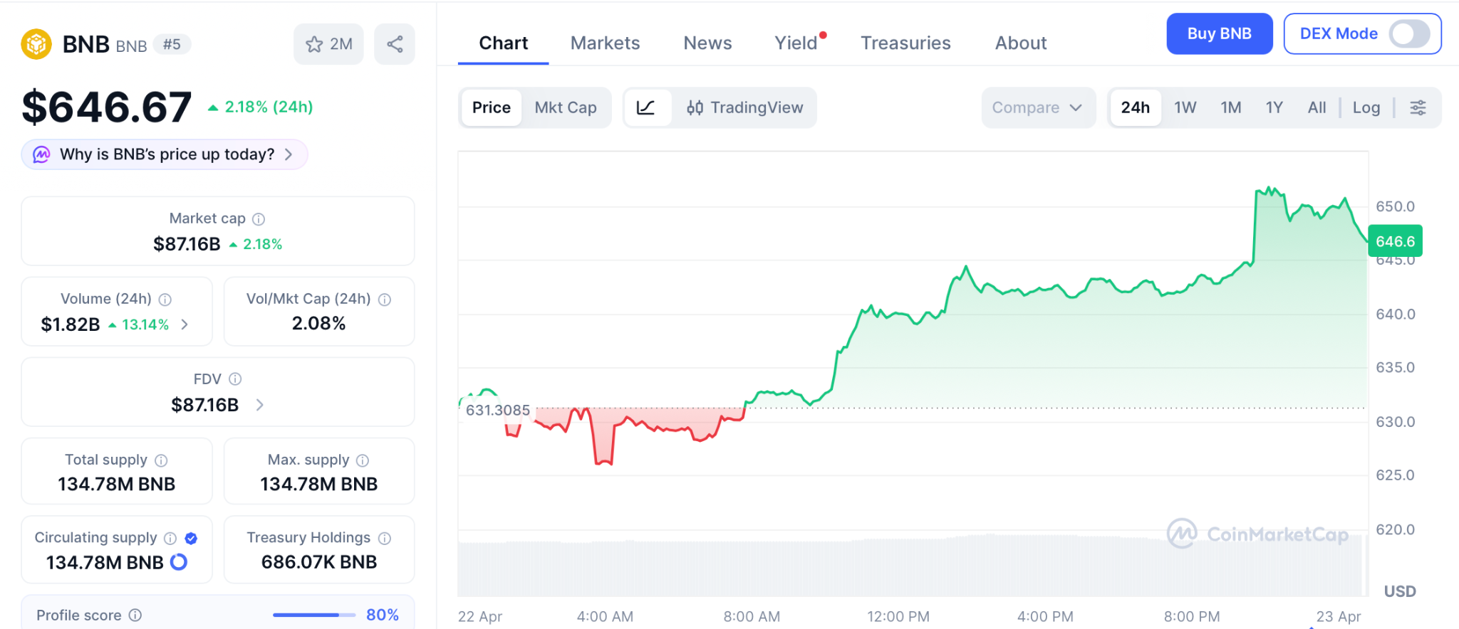 BNB (币安币) 价格646美元,450万日活用户引领所有L1网络
