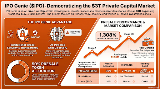 私募市场过去需要25万美元和正确的姓氏。2026年的变化在于谁获得了参与机会,而IPO Genie正是这一转变最清晰的例证。双重审计、团队锁定、已验证的AI交易信号、50%的预售分配额、低至10美元的真实入场点。这些不是路线图和白皮书上的承诺,其中大部分已上链并可公开验证。
